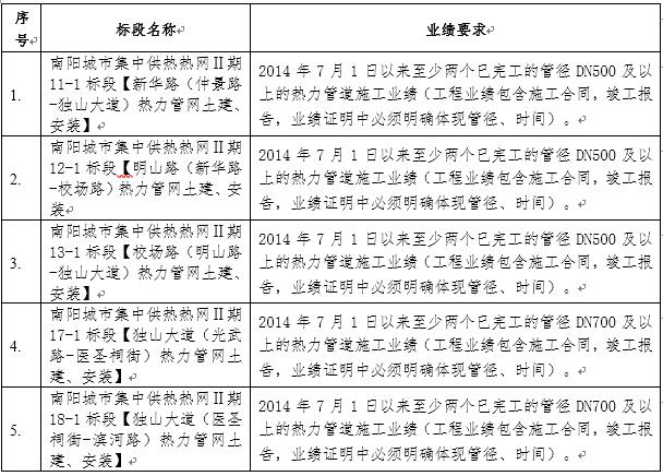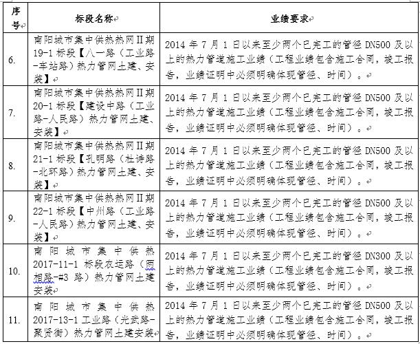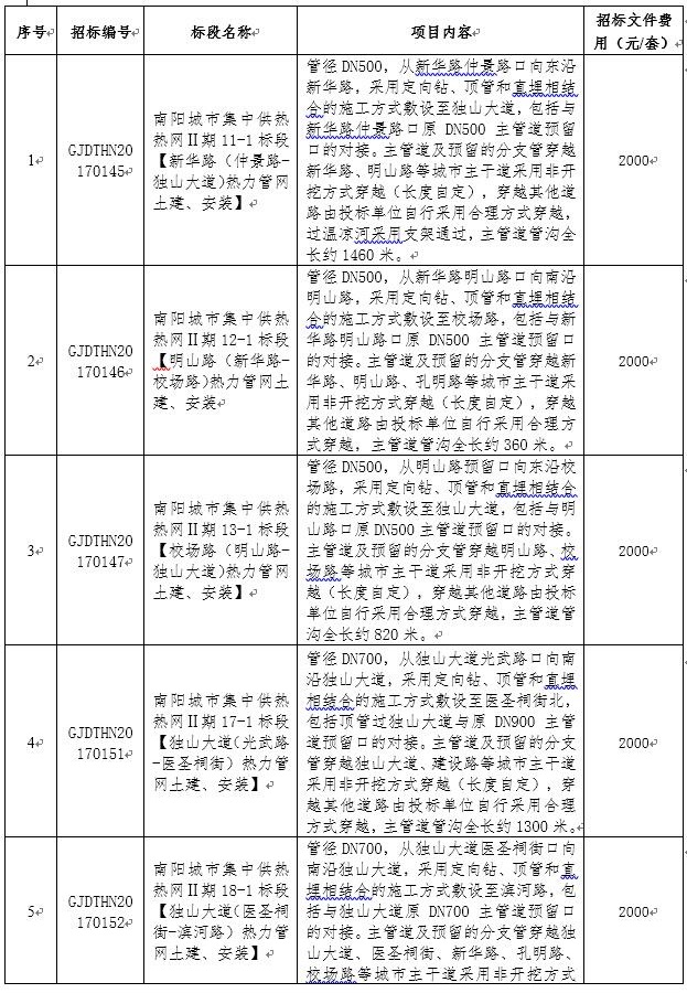 特别说明:南阳城市集中供热2017年技改项目11-1、13-1;热网Ⅱ期11-1、12-1、13-1、17-1、18-1、19-1、20-1、21-1、22-1热力管网土建安装工程标段,同一投标单位最多同时中标2个标段,如同一投标单位在3个及以上标段中综合排序为第一名,则按所有标段总投资最低原则进行调整,给予该单位2个标段中标,剩余标段排序重新调整。