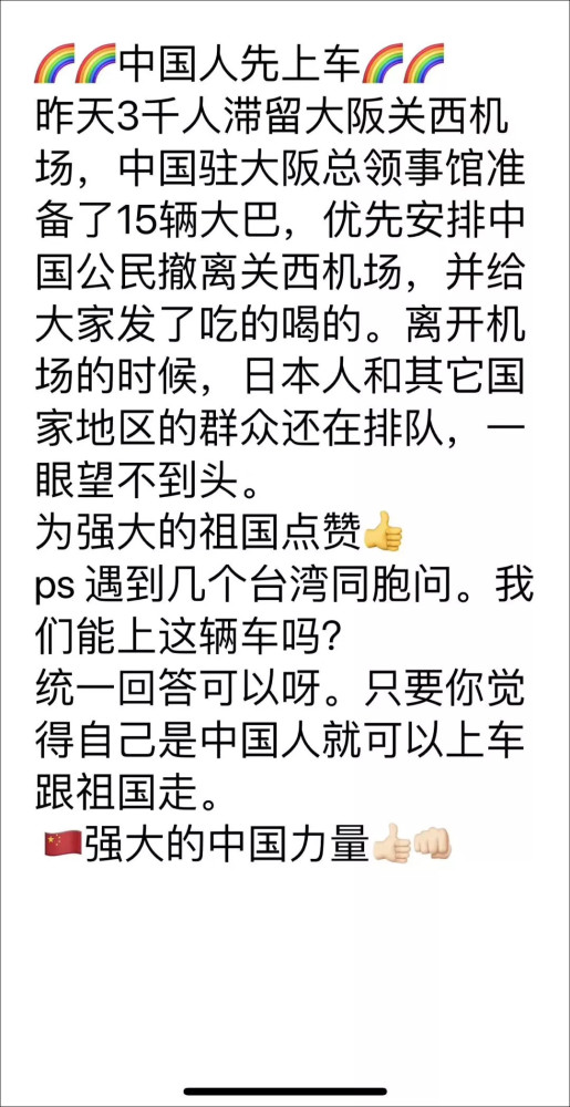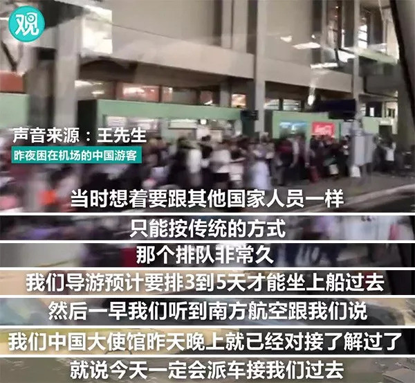 另外,这次撤离过程中还有一个插曲。有人发朋友圈称,滞留旅客中也有一些台湾同胞,询问能不能一起上车,得到的答案是——觉得自己是中国人就能上车。