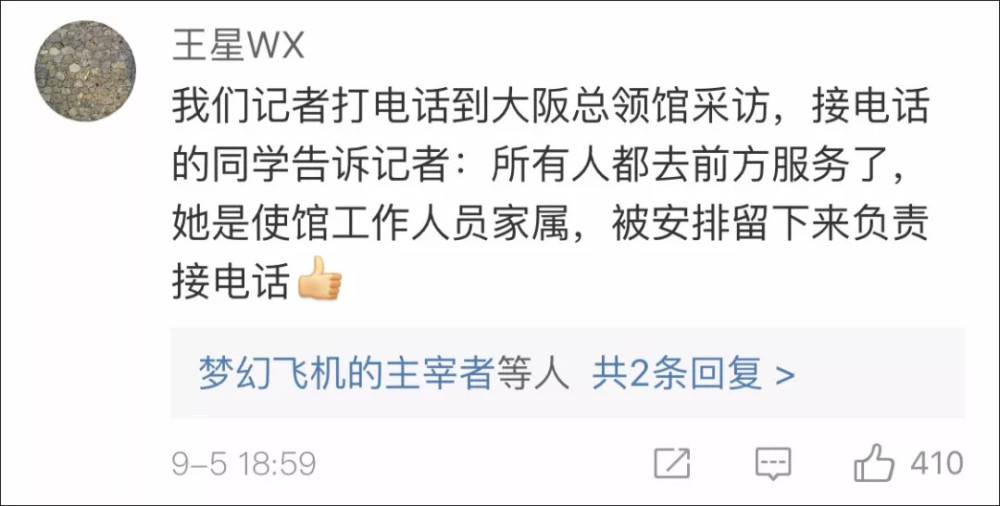 北京时间记者致电大阪总领馆,接电话的人说,所有人都去前方服务了,她是使馆工作人员家属,被安排留下来负责接电话。