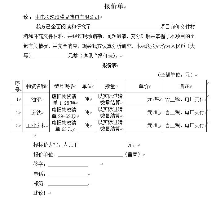 中电投珠海横琴热电有限公司对处置废旧物资项目进行公开询价,现进行公开询价,欢迎有兴趣的投标人参与投标。